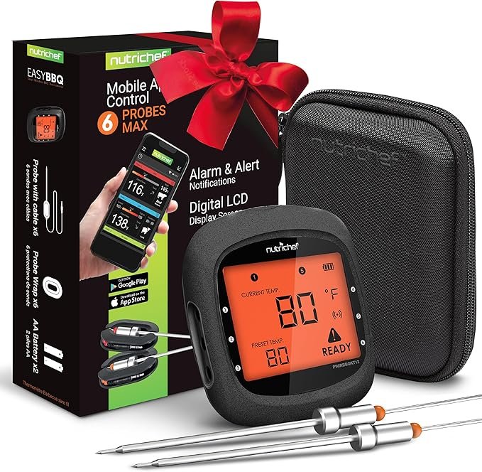 The NutriChef Smart Bluetooth Thermometer combines functionality and portability for every level of cook. Equipped with 2 stainless steel probes (expandable up to 6), it enables you to track multiple dishes simultaneously. The included travel zip case makes it a perfect on-the-go grilling companion. It features a 200+ ft Bluetooth range and an intuitive LCD display for real-time monitoring. You’ll receive app-based alerts when your food reaches the set temperature, so you’ll never overcook a steak again. Whether using a gas grill, charcoal BBQ, or smoker, this thermometer helps you achieve consistently great results with minimal effort.